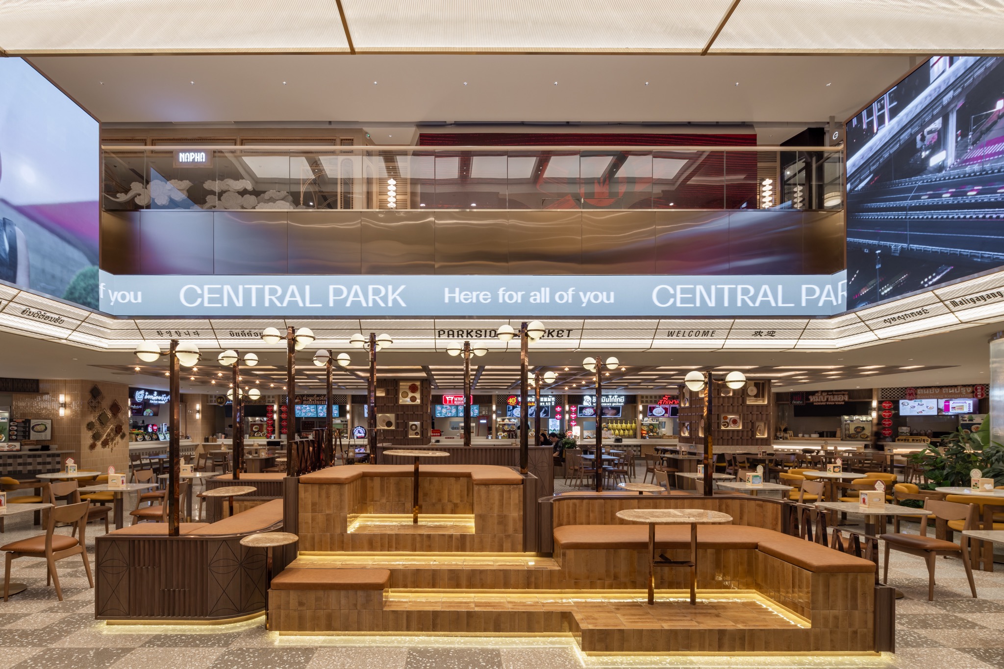 Bangkok’s old neighborhoods were once filled with the charm of standalone cinemas, vintage lampposts, and vibrant public life. These memories inspire a tiered seating platform that reflects the city’s past culture of movie-going and urban gathering.
