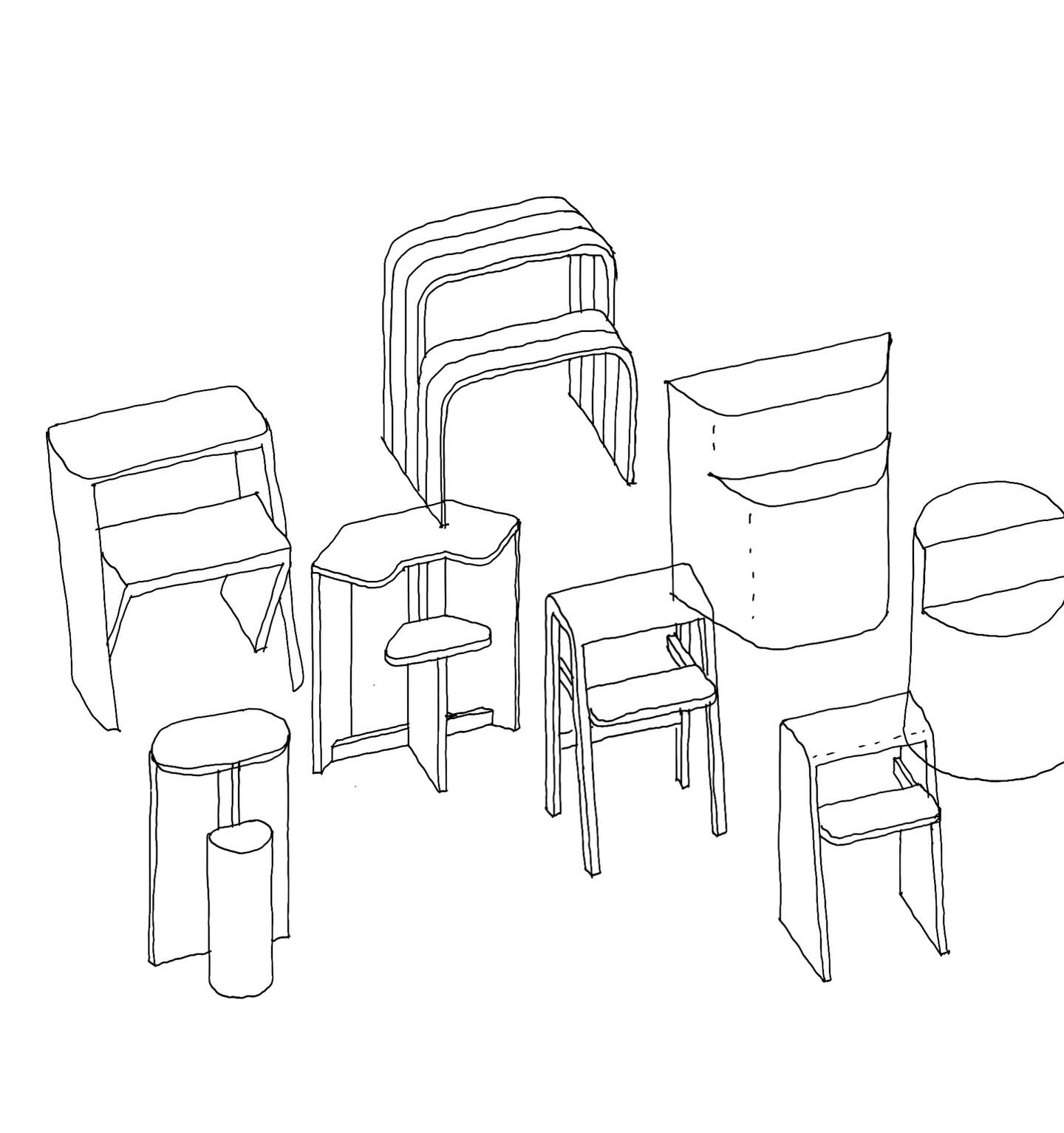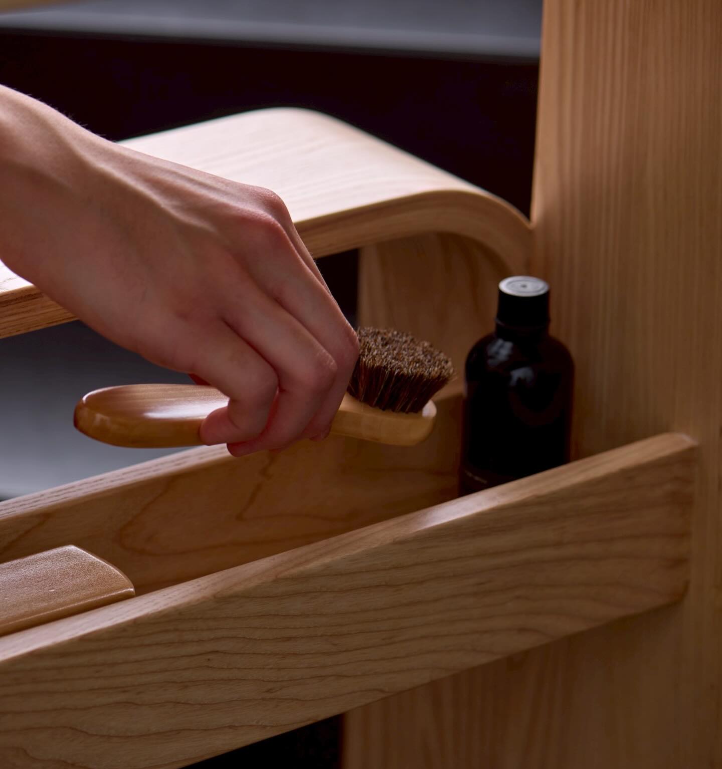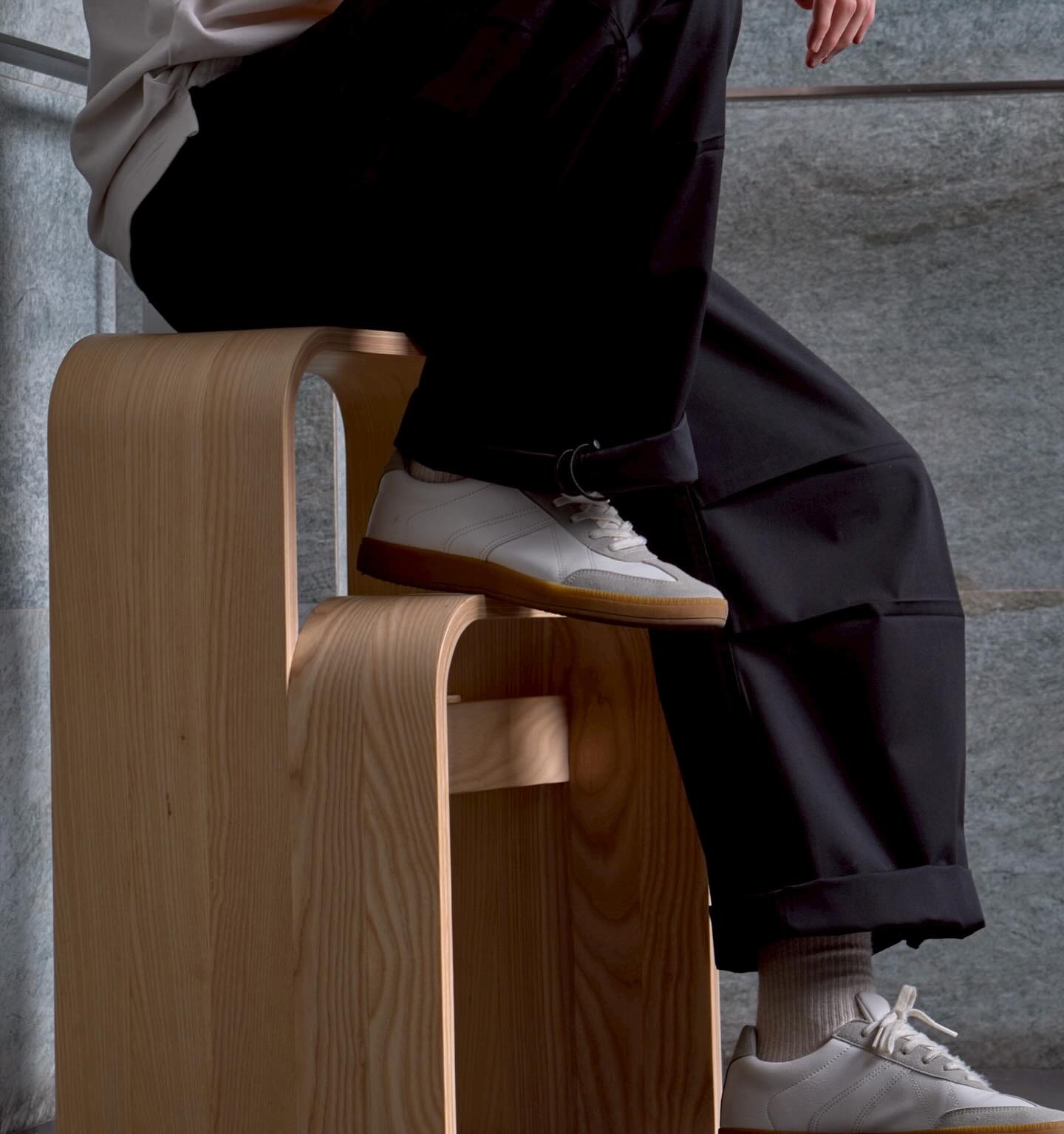 Made from bent laminated wood with a structural central beam for strength and easy-reach storage.