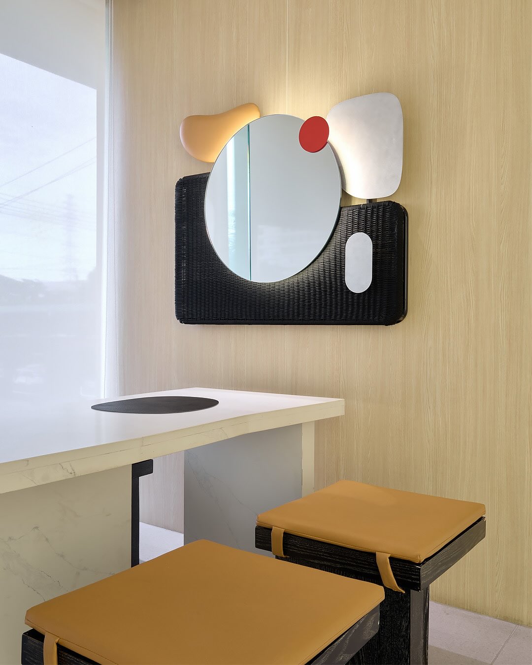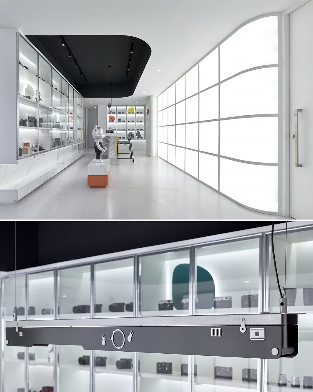 Artworks inspired by photography are thoughtfully placed throughout the space, adding warmth, playfulness, and a sense of personal touch. A softly curved wall lined with concealed LED lighting provides even illumination for camera testing, while the deep black ceiling brings spatial depth and contrast—balancing professionalism with quiet intimacy.