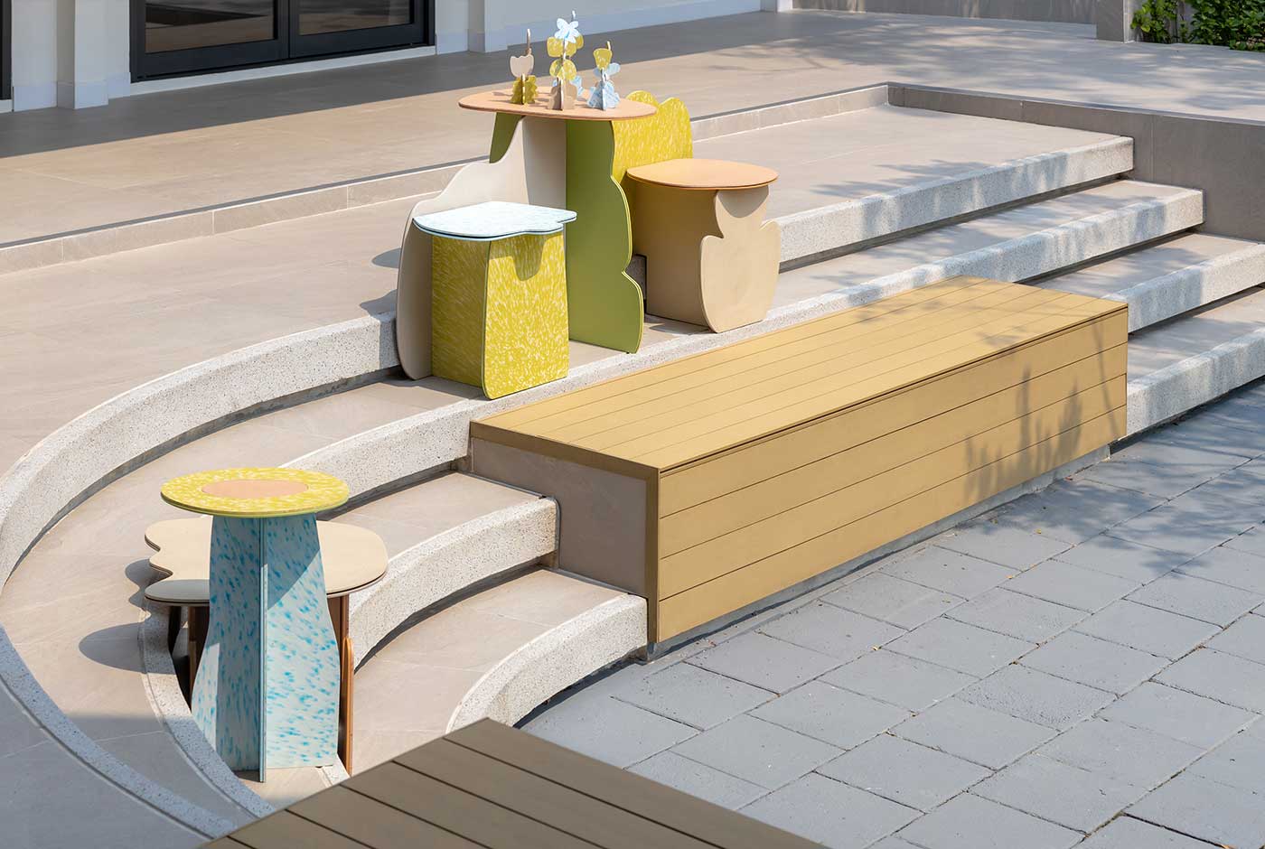 Stair-integrated furniture that encourages creative activities through assembling flower-like forms, fostering play and interaction among users.