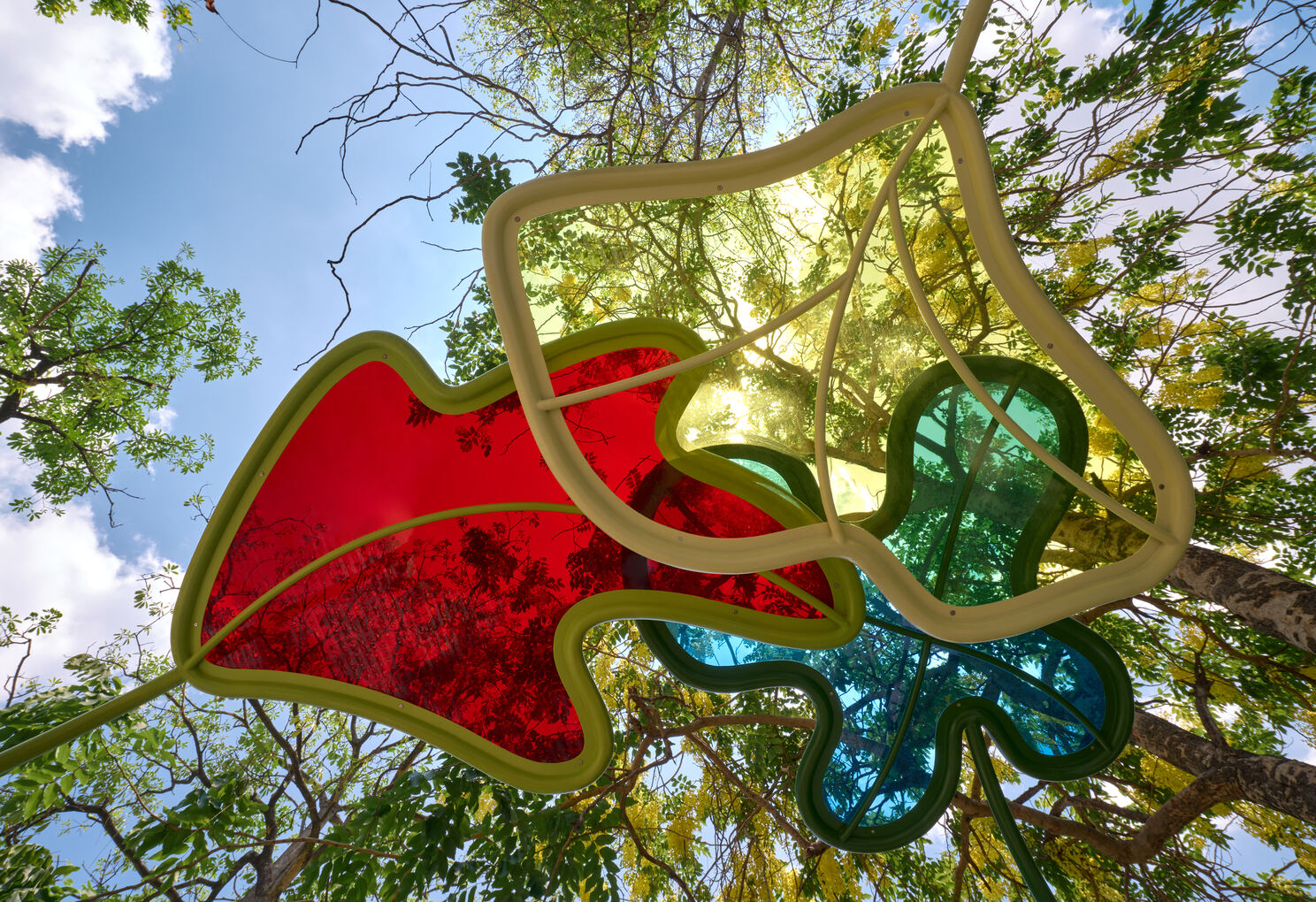 A structure that plays with light and shadow through translucent colored panels, creating ever-changing patterns and atmospheres that stimulate imagination.