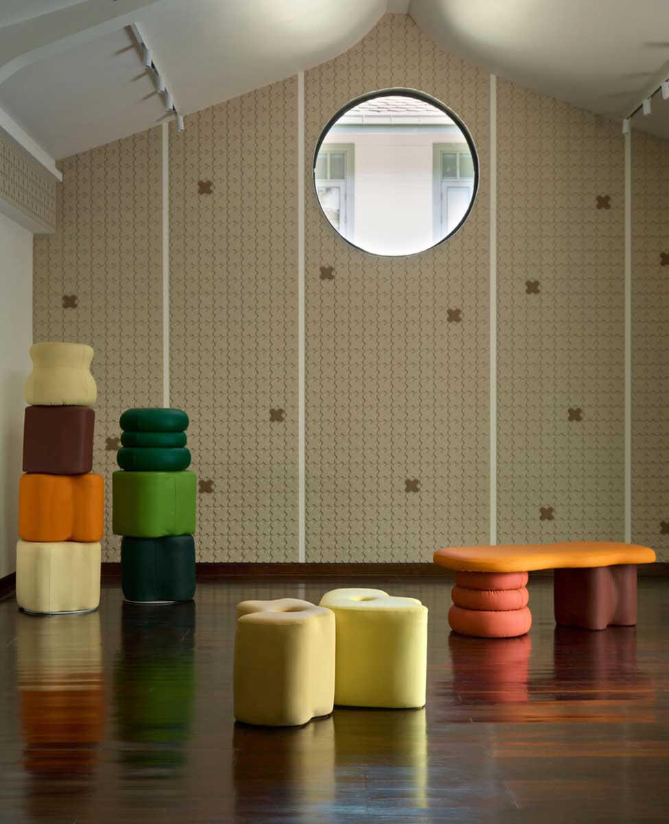 A collection of soft seating in various shapes and colors, designed to be stackable into sculptural forms, saving space while maintaining visual appeal even when not in use.